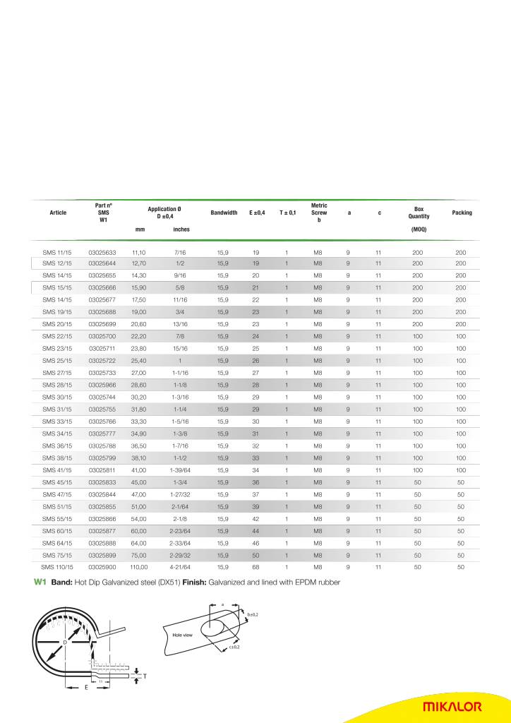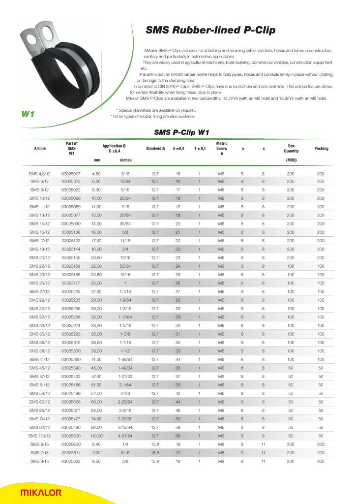 Mikalor SMS P-Clips are available in two bandwidths. 12,7mm (with an M6 hole) and 15,9mm (with an M8 hole).