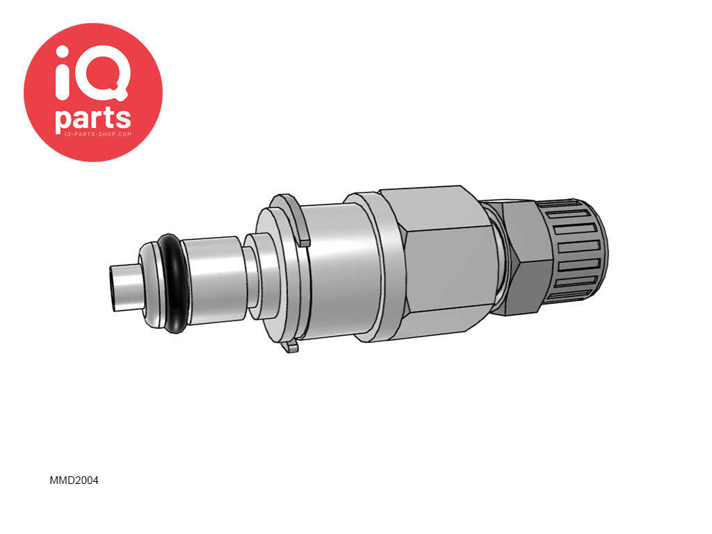 An in-line coupling Insert of CPC from the Multi-Mount series with a PTF Nut 6.4 mm (1/4") OD / 4.3 mm (0.17") ID. This quick coupling (male) ensures a leak-free seal, partly provided by a Buna-N (NBR) sealing ring. This coupling is available with a valve (MMD2004) or without a valve (MM2004). (Choose at the top right at “Make a choice:”)