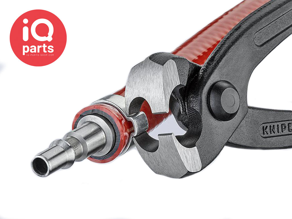 Knipex developed the 10 99 I220 ear clamp pliers together with the inventor of the Oetiker hose clamps. The pressing noses are shaped so that they fit perfectly onto the ear clamps and do not damage the clamp ears during closing.