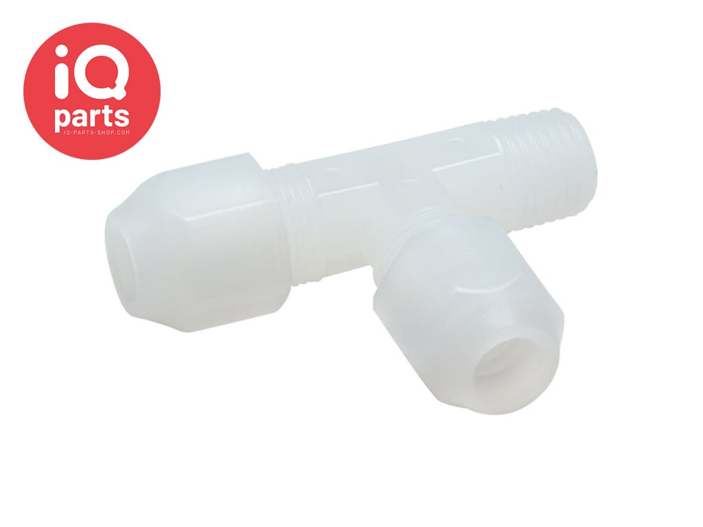 This LE- male coupling connects 2 hoses to your application. It consists of 2 hose connections perpendicular to each other and a screw connection in line with 1 hose connection. The material is FDA-compliant, making it suitable for use in the food industry, as well as in the semiconductor, chemical, pharmaceutical, and food industries. The fittings are manufactured, packaged, and sealed in a clean room, making them suitable for cleanroom use.