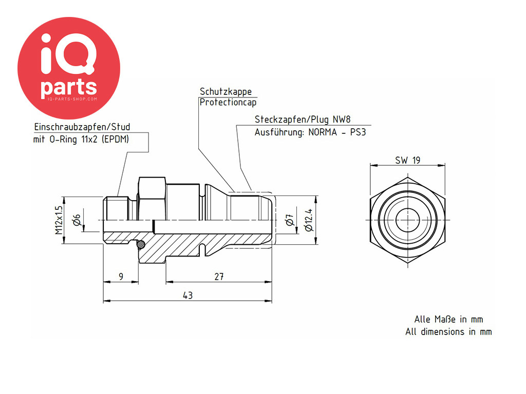VDA screw-in spigot NW08 - M12x1.5 for NORMAQUICK PS3 for screwing in, has a nominal width of 8 (NW08). This means that the internal size of the screw-in spigot is 8 mm. The male thread M12x1.5 makes it possible to screw in the spigot. Due to the EPDM seal (under the hexagon), the screw thread does not need to be additionally sealed.