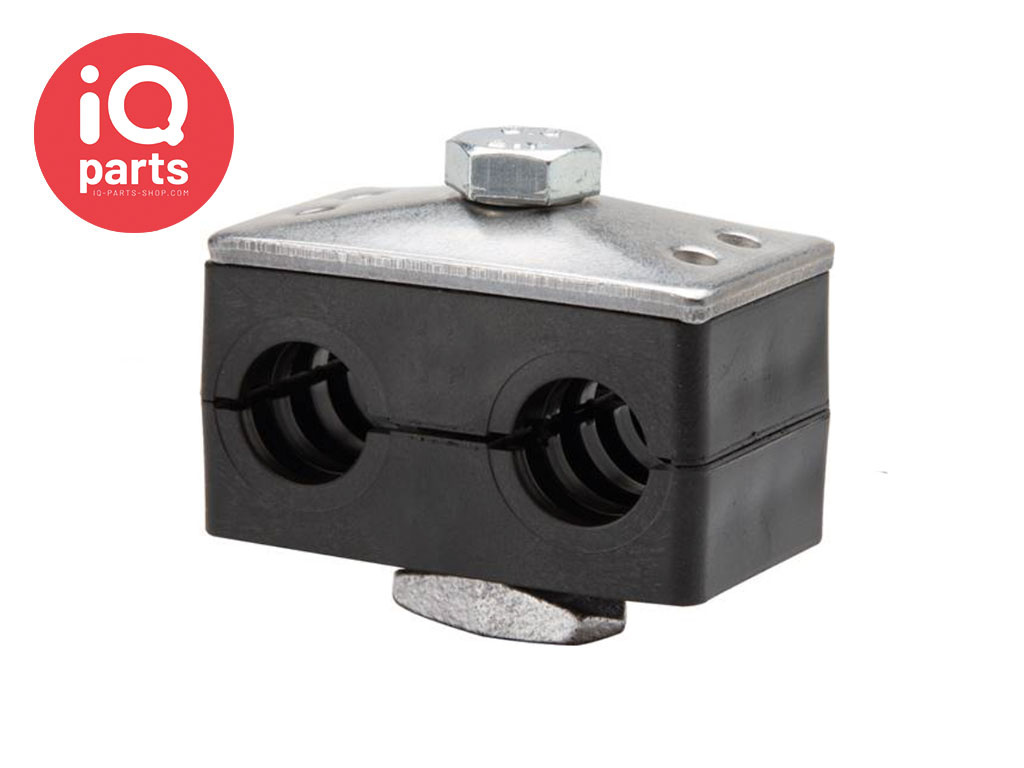 Deze buisklem bestaat uit een Polypropylene klemdeel voor 2 buizen, slangen of kabels en een dekplaat welke door middel van een bout geklemd worden op een C-Rail.