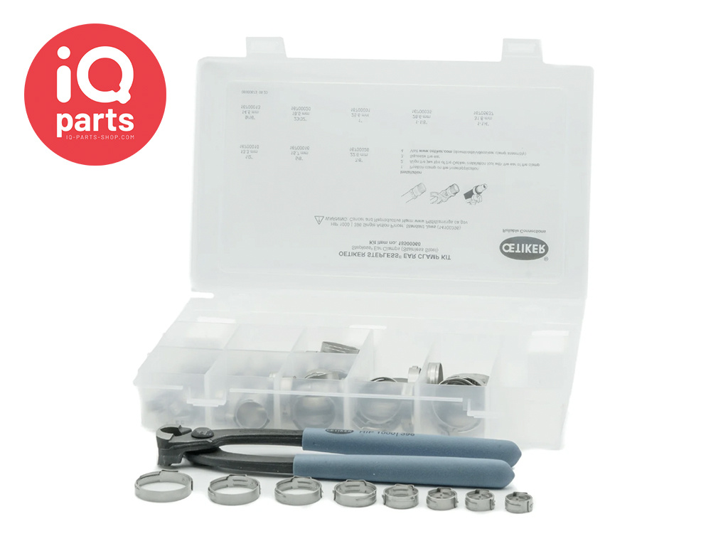 Deze set van 81 stuks bevat: Klemmen (80 stuks, Oetiker Stepless® 1-oorklemmen, roestvrij staal) en 1 Hand Tang: