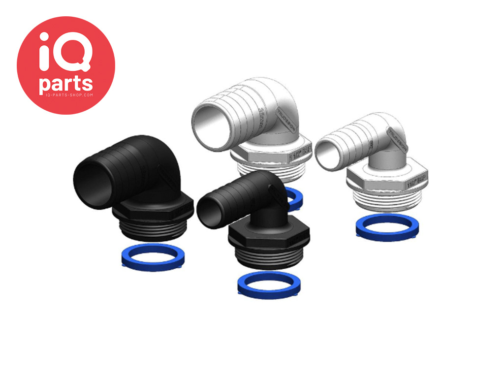 90º uiteinden zijn geschikt voor standaard slangmaten. De uiteinden zijn voorzien van een dikkere blauwe afdichtring, zodat de fitting indien nodig naar een geschiktere positie kan worden gedraaid.